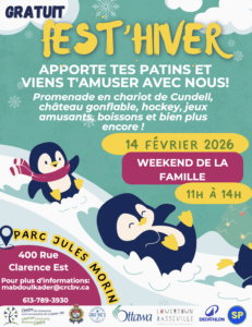 Soyez des nôtres pour Fest’Hiver : une merveilleuse fête communautaire qui se tiendra au parc Jules Morin (et également à l’intérieur du bâtiment 40, rue Cobourg) le samedi 14 février, lors de la journée de la famille. Au grand plaisir de vous y voir !